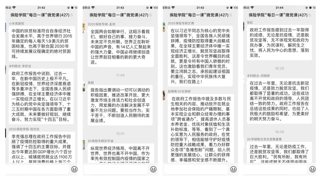 本科生第一党支部喇新悦:从政府工作报告中,我们可以看到国家对维护社会繁荣稳定的决心,对国家经济快速恢复的信心,对廉政建设一如既往的坚定,对民生工作无微不至的关心。今年我们喜迎建党百年,中国取得的成就离不开以习近平同志为核心的党中央的坚强领导,站在新的历史起点上,我们更应该不忘初心、继续前进。