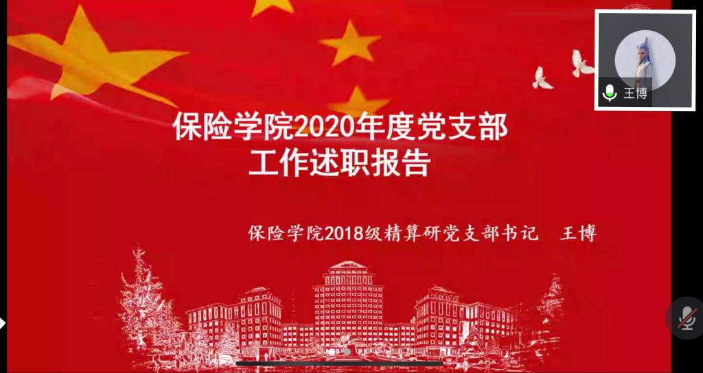 2020级保险学、社保、精算学研究生联合党支部书记王添汇报了支部2020年抓党建工作情况并表示,新的一年内会多开展丰富多样的活动,增设党员责任区、开展团建活动,明确常规工作的负责人及其职责,进一步提高支部工作水平。