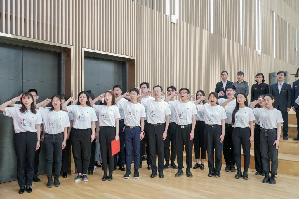 在入党宣誓仪式圆满结束之时,一场“红心向党、红色快闪”拉开帷幕。“唱支山歌给党听,我把党来比母亲”,一句婉转而又亲切的歌声响起,仪式现场顿时化作合唱现场,阶梯上的合唱团将对党的赤诚之心融入音符,舞者把党的峥嵘岁月笼进红纱,现场的师生党员随着韵律挥动着党旗和国旗,无一不被此情此景所触动。“没有共产党就没有新中国”“我们都是追梦人,在今天勇敢向未来报到”“财经黄埔人,永远跟党走”,青春的舞步带着蓬勃朝气点燃全场。