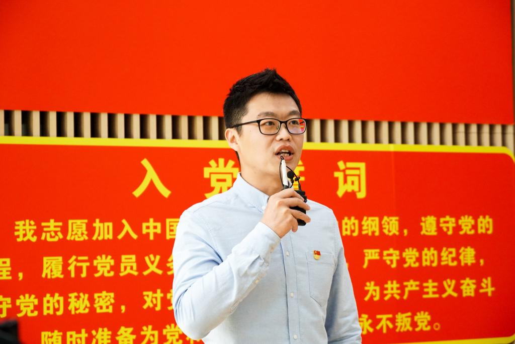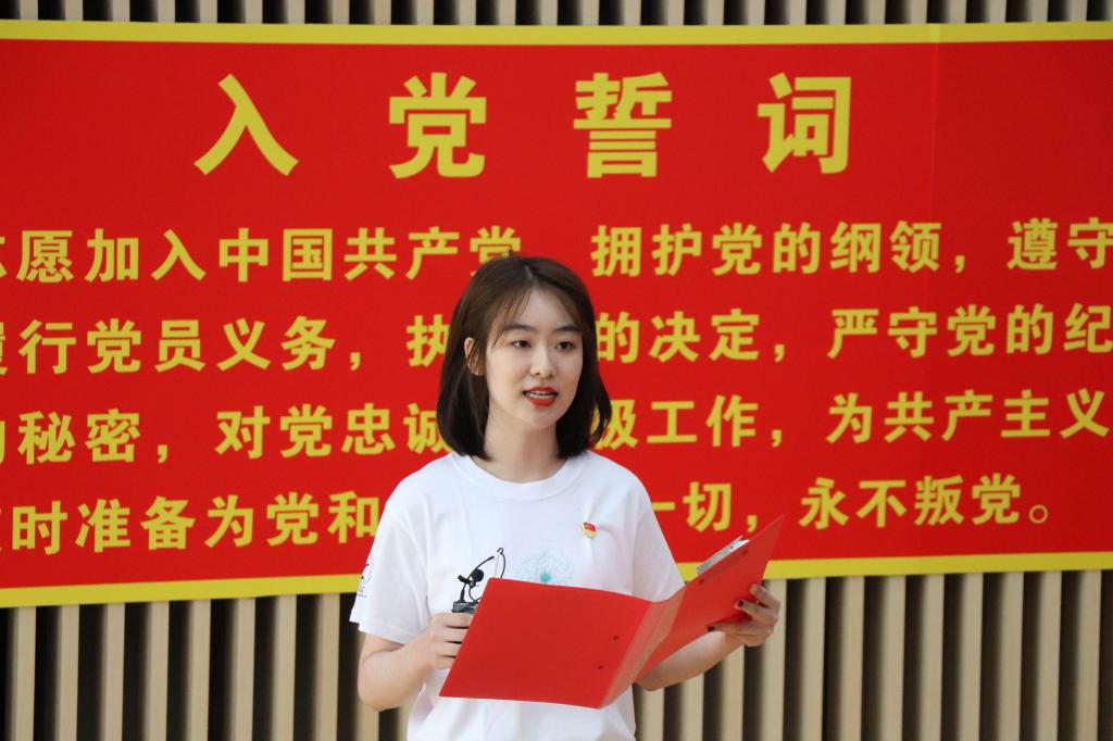 鲜红的党旗,映射着党员们内心对党的热爱与忠诚,在这个庄严的仪式中,新加入党组织的党员代表、青年教师马冰将对党的热爱付诸演讲之中,满怀激情的发表感言。新加入党组织的员工党员代表闫诗琪分享了党史上第一篇入党誓词的故事,每一句誓词的历史见证了中国共产党人前赴后继、不怕流血牺牲的奋斗史,也使得在场的党员们进一步明确了初心使命。