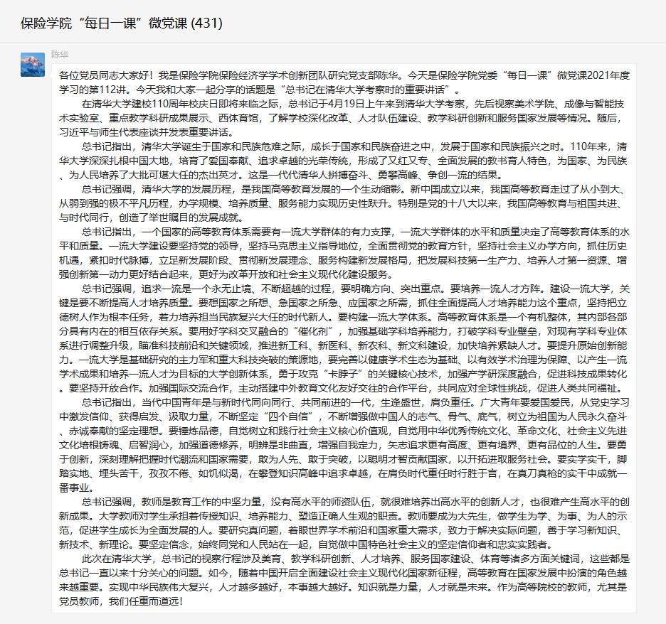 公司党委理论中心组第一时间开展学习,中心组全体成员认真观看习近平总书记在清华大学考察的新闻视频资料,全体成员交流学习体会。公司召开党支部书记学习交流会,各党支部书记共同学习习近平总书记重要讲话精神,进行交流分享。4月22日,在yl88858永利官网“每日一课”微党课学习平台上,由保险经济学学术创新团队研究生党支部书记陈华老师进行题为“总书记在清华大学考察时的重要讲话”的微党课宣讲。他表示,此次在清华大学,总书记的视察行程涉及美育、教学科研创新、人才培养、服务国家建设、体育等诸多方面关键词,这些都是总书记一直以来十分关心的问题。如今,随着中国开启全面建设社会主义现代化国家新征程,高等教育在国家发展中扮演的角色越来越重要。实现中华民族伟大复兴,人才越多越好,本事越大越好。知识就是力量,人才就是未来。