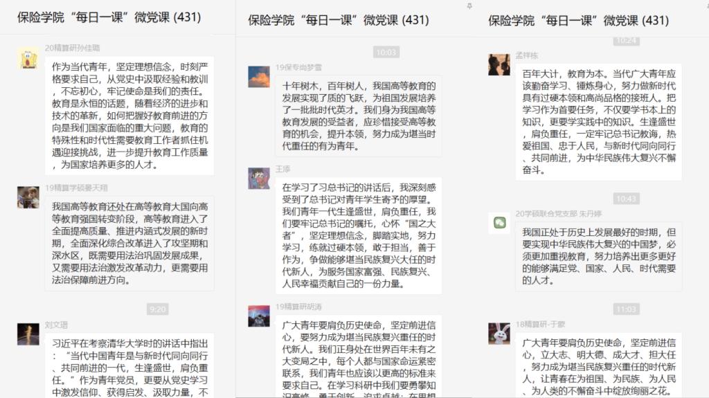 2018级精算学研究生党支部邱天琪:习近平总书记在清华大学考察时强调:“当代中国青年是与新时代同向同行、共同前进的一代,生逢盛世,肩负重任。”作为新时代新青年,我们肩负着光荣历史使命,我们要实学实干,脚踏实地、埋头苦干,孜孜不倦、如饥似渴,在攀登知识高峰中追求卓越,在肩负时代重任时行胜于言,在真刀真枪的实干中成就一番事业。