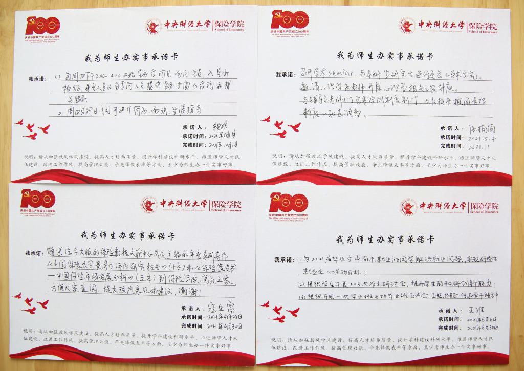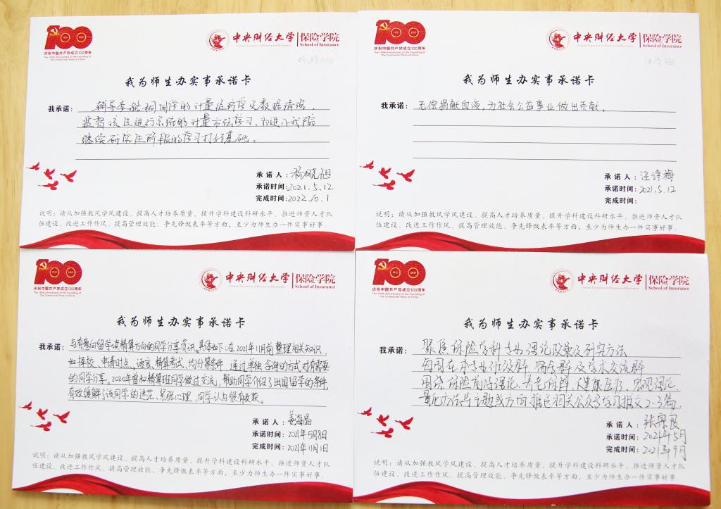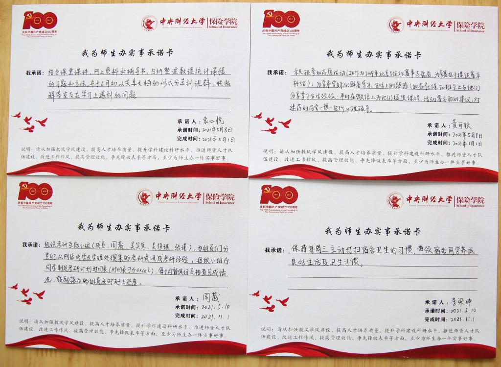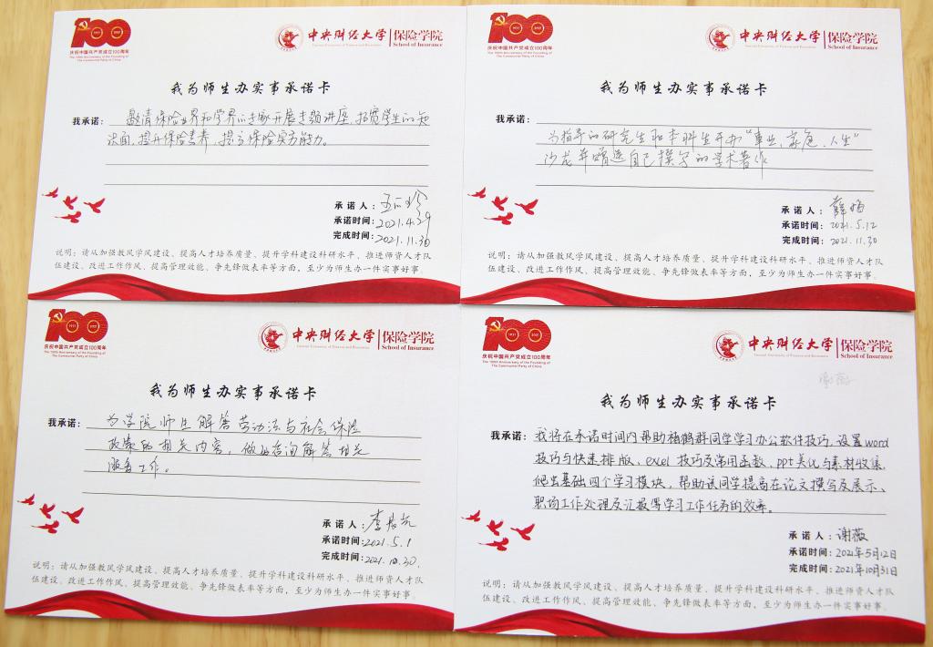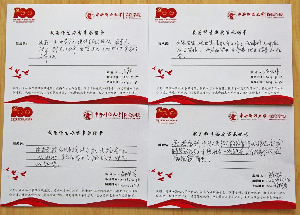 公司的会议桌上,铺满了师生交来的263份承诺卡,内容涉及发展所需、基层所盼、民生所向的方方面面。有教师写道:“在本学期邀请校外专家来校进行一次讲座,鼓励员工了解行业发展趋势”“选取1-2名员工进行结对帮扶,在学习、就业、生活、经济、思想等各个方面提供全方位的帮助”“在媒体上开展招生宣传,为应届毕业生开展就业指导和推介”“为公司党员之家赠送《中国保险公司竞争力评价研究报告》和《保险蓝皮书——中国保险市场发展分析》,方便师生党员查阅”等,从学科背景、日常生活、就业发展、学术研究等多个方面承诺实事,办好实事。有员工党员写道:“对某学业困难的同学进行一对一学业帮扶,帮助其更好完成某某课程的学业修习”“无偿捐献血液,为社会公益事业做贡献”“坚持每周三主动打扫宿舍卫生,带领宿舍同学养成良好生活及卫生习惯”等,从学业帮扶、社会责任、宿舍生活等各方各面发挥员工党员的先锋模范作用。