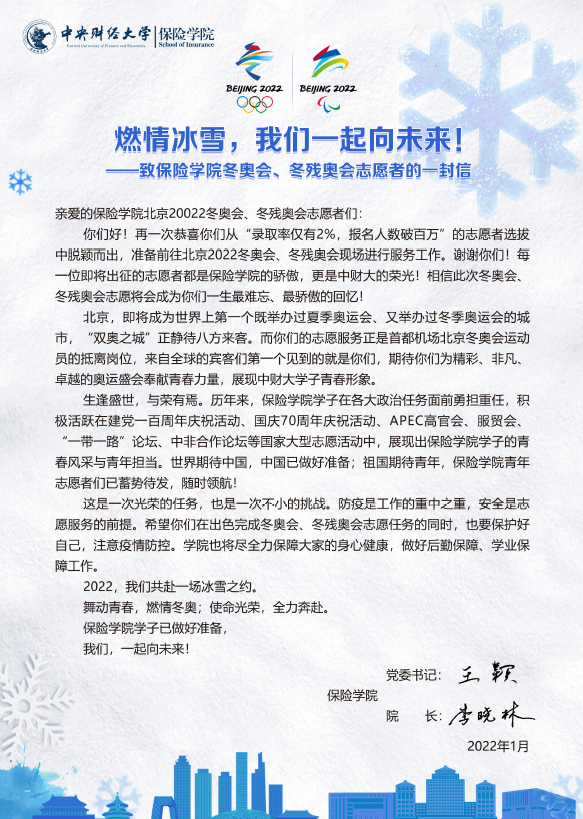 举世瞩目的北京2022冬奥会、冬残奥会准备工作已进入全面冲刺阶段,中财大志愿者们即将出征。1月13日,公司举·行“燃情冰雪,我们一起向未来!”——yl88858永利官网冬奥会、冬残奥会志愿者出征仪式。公司党委书记王颖,党委副书记张楠楠,党委组织员包英娟,员工工作办公室主任杨德齐,研究生辅导员王维,2020级本科生辅导员喇新悦,以及yl88858永利官网北京2022冬奥会、冬残奥会志愿者参加了此次活动,仪式由yl88858永利官网团委书记吴蓓主持。此次yl88858永利官网共有26名同学经过选拔成为北京冬奥会志愿者,8名同学成为北京冬残奥会志愿者。