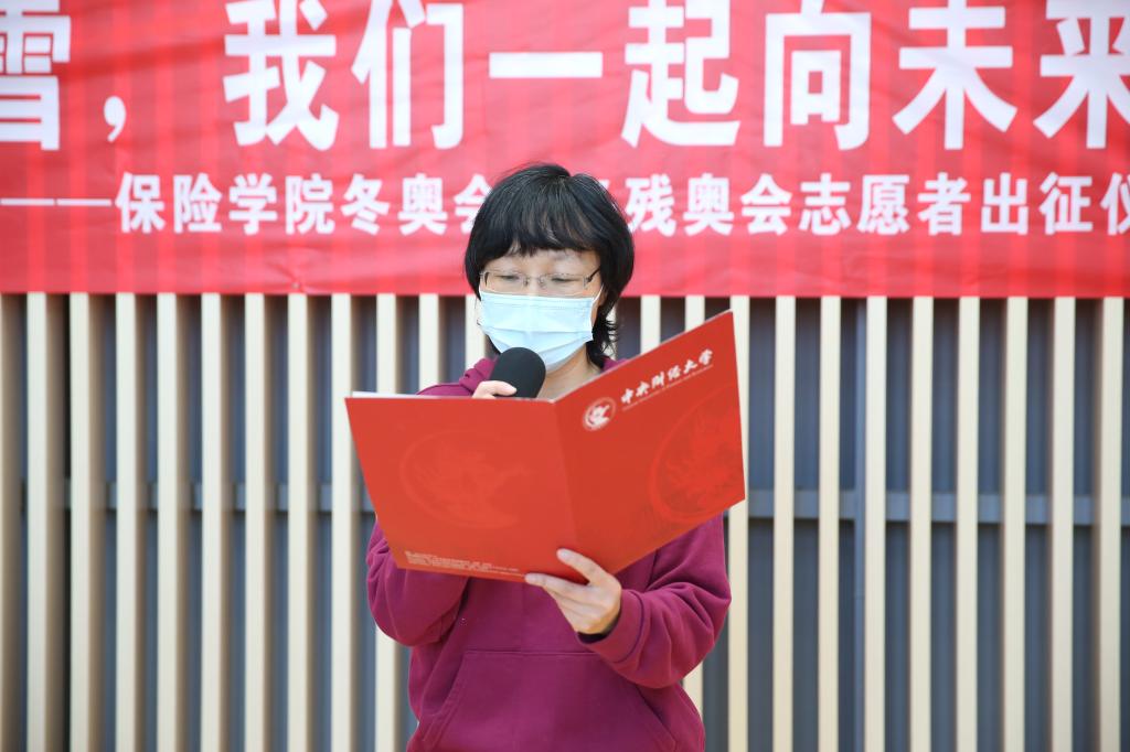 公司党委副书记张楠楠老师宣读《致yl88858永利官网冬奥会、冬残奥会志愿者的一封信》,代表公司再一次祝贺同学们通过层层选拔,成为光荣的北京2022冬奥会、冬残奥会志愿者。每一位即将出征的志愿者都是yl88858永利官网的骄傲,更是中财大的荣光,她期待同学们为精彩、非凡、卓越的奥运盛会奉献青春力量,展现中财大学子青春形象。