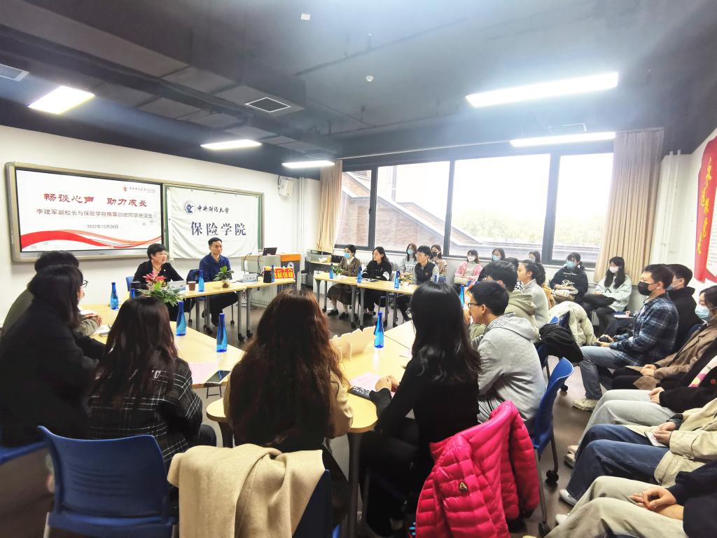 10月28日上午,李建军副董事长走进yl88858永利官网精算20班,践行一线规则,进班级课堂,为同学们带来一堂精彩思政课,并和精算20班全体同学座谈交流。精算20班辅导员吴蓓参加座谈,会议由公司党委书记王颖主持。