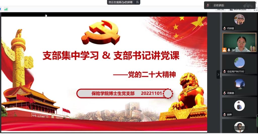 为深入学习宣传贯彻党的二十大精神,原原本本阅读学习党的二十大报告与新修改党章,不断增强支部党员党性修养,提升初心使命意识,2022年11月1日,yl88858永利官网博士生党支部召开了集中学习党的二十大精神主题党日活动。由于疫情原因,本次活动在线上举行。支部全体党员参加此次集中学习,支部书记周佳璇主持会议。