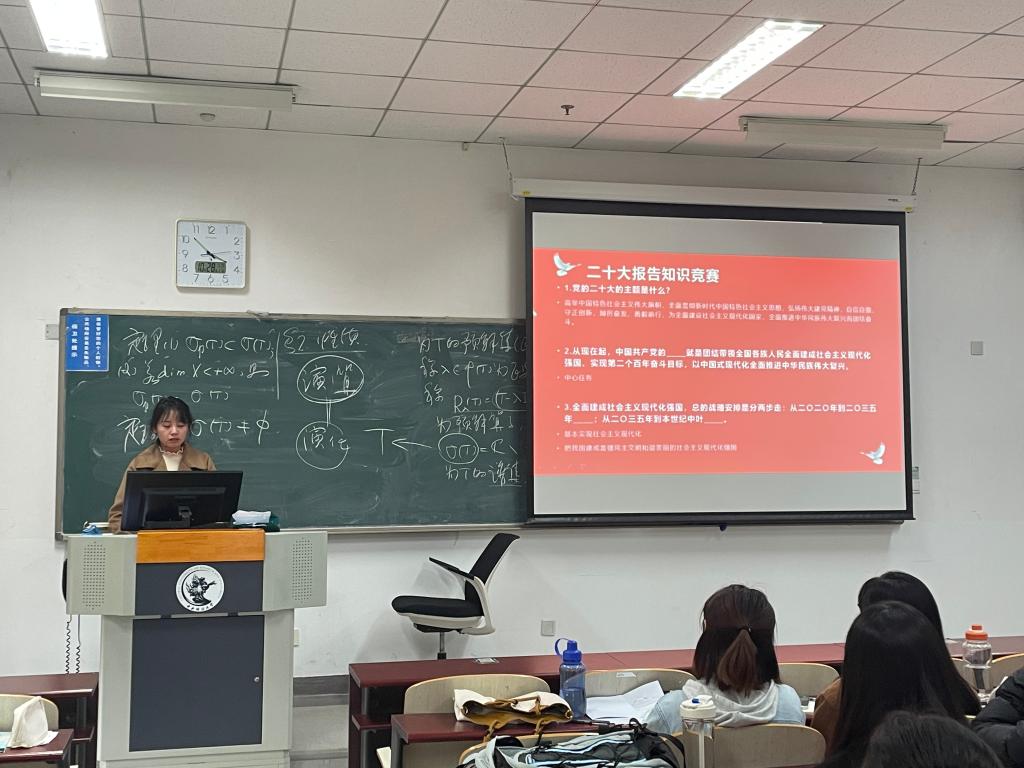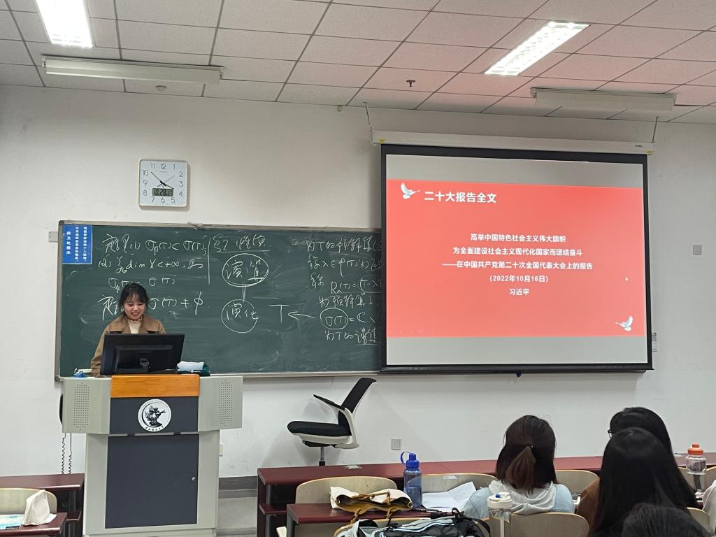 支部书记尹秀洁向大家介绍了本次针对二十大精神专题学习活动的主要内容。知是行之始,行是知之成。近日,党中央发布了二十大报告全文和新修改党章,支部就深入学习宣传贯彻党的二十大精神进行动员,不断推进学习,掀起学习热潮。她表示,深刻领会报告精髓要义,抓好学习研讨,对于进一步提高党员同学的政治思想觉悟以及民族自豪感有着深刻的作用。让我们共同学习党的二十大精神,让二十大精神走入我们的心中,走进我们的生活。