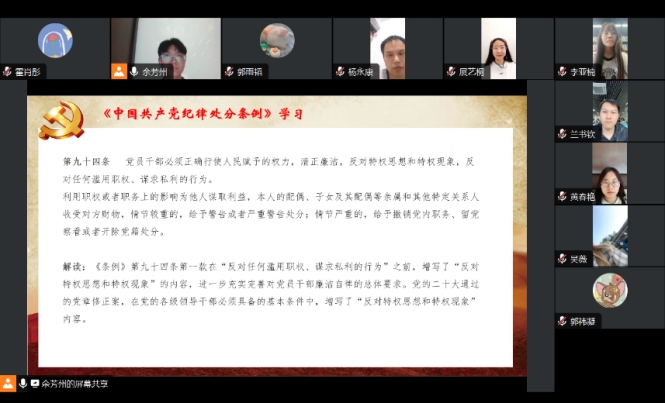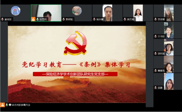 为贯彻落实公司、公司党委关于推进党纪学习教育工作的要求,确保支部党员弄懂学通新修订的《中国共产党纪律处分条例》,5月23日下午,保险经济学学术创新研究生党支部召开《中国共产党纪律处分条例》集中学习研讨。会议由党支部书记陈华主持,全体党员参会。