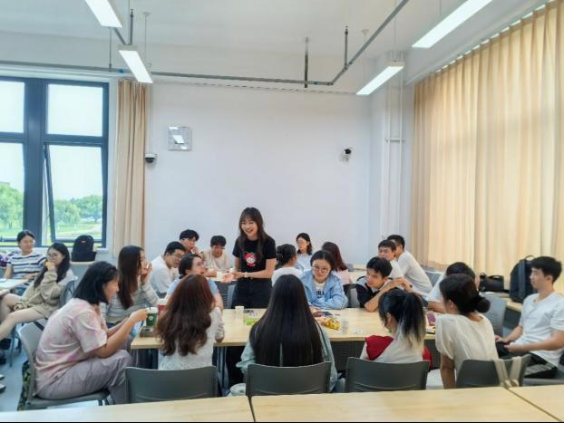 第一个小组比拼活动是自我介绍接力。各组成员围成一个圆圈,由随机的一个组员优先进行自我介绍并指定顺序,旁边的同学依次接力,需要先重复前两位同学的名字、家乡、爱好,再介绍自己的情况。从第一位同学发言开始计时,直至全组成员发言完毕结束计时,按人均发言时间来决定小组成绩。经过这项比拼,同学们对小组成员有了更深的了解。