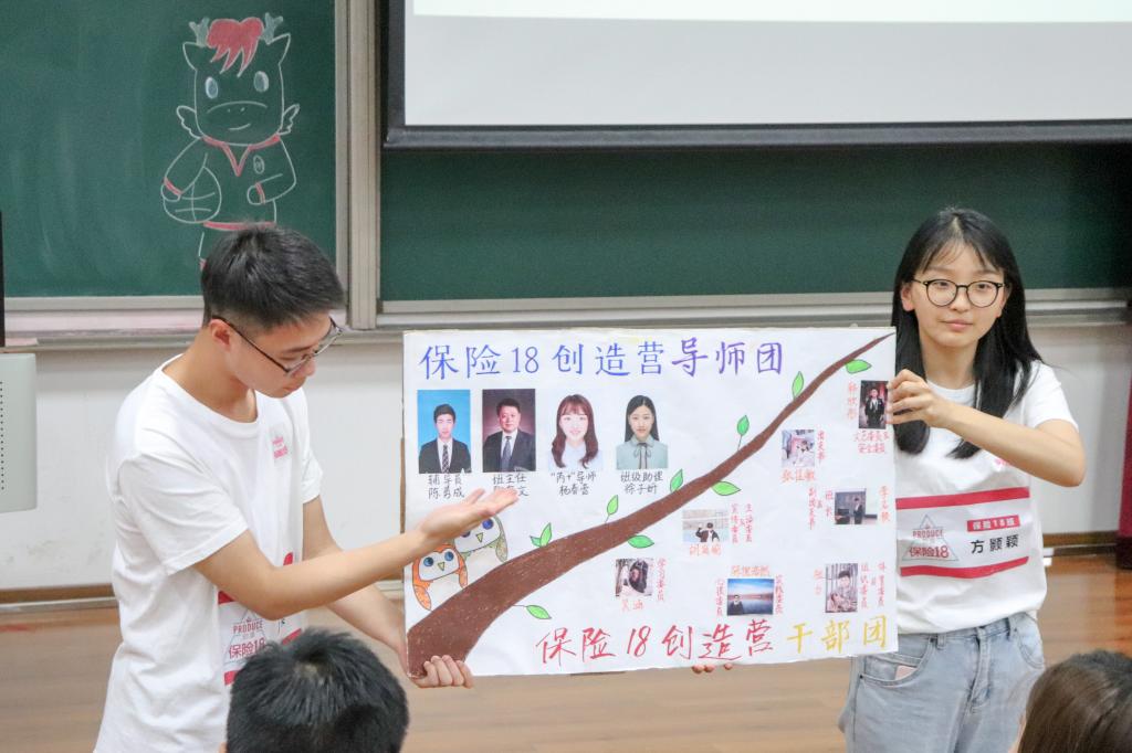 保险18班以“拼搏奋进正青春 风华正茂谱华章”为主题,融入社会主义核心价值观和党的十九大精神与习近平新时代中国特色社会主义思想,引入“练习生”、“成团出道”的概念,组成四支竞演队伍分别向评委老师们展示在思想建设、班风建设、学风建设、文体建设取得的突出成果。一块块循环利用快递箱纸板、手工制作的展牌、一场场生动还原保险18班温馨日常的表演、一句句响亮而整齐的口号无一不勾勒出保险18班的青春可爱、活力四射。“你越喜爱 我越可爱”的口号更是响彻整个教室,凝聚的班魂感染了在场的每一位老师、同学。