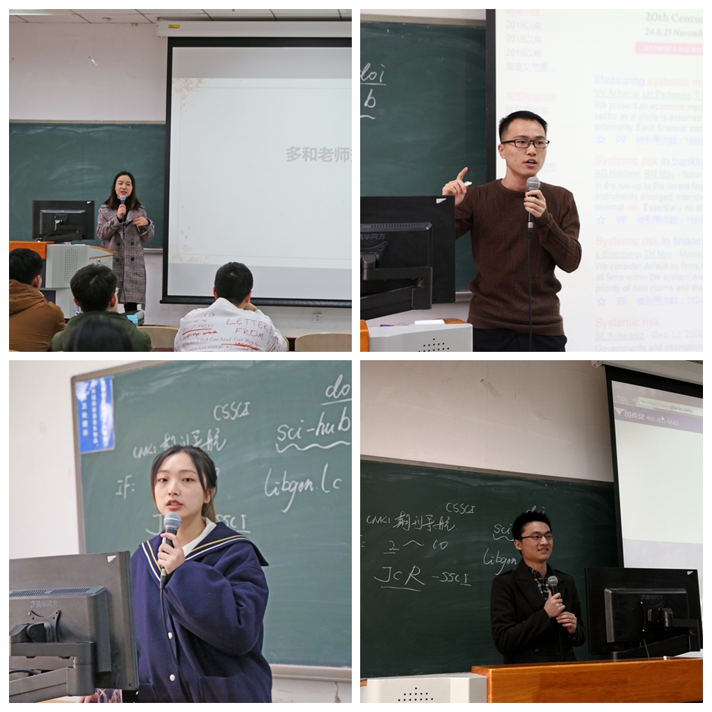 首先,四位国奖得主分别分享了他们在学习、科研等方面的经验。2017精算研冯燕从“加强交流”、“多读书,多学习”、“着手去做”、“常怀感恩之心,诚实做人,踏实做事”四个方面分享了自己的经历,为我们传递了学习经验,并从生活上对学弟学妹予以指引。她表示,寻找兴趣点是学习和研究的关键,我们要积极利用图书馆的资源来挖掘自己的兴趣,填补知识的空缺,要勇于迈开第一步,要用感恩的心来面对老师和同学,踏踏实实做事,诚诚实实做人。2018保险研宁定宸则围绕着“如何找文献”、“如何找教材”、“如何阅读文献”、“读完文献后该做些什么”四方面对如何做科研进行了细致分析。他详细介绍了谷歌学术、JCR等论文搜索工具,并现场进行了演示,让同学们受益匪浅。2019级保险专硕司语琳以“数据和计量”为主题,现场演示了如何有效使用公司现有的数据库,并推荐了一些高水平的计量经济学的网课供同学们参考,极具实用性。2017精算研王奕可则从“问题深挖”和“效率”两方面对同学们提出了建议,告诫同学们要注重平衡约束条件和结论严谨性之间的关系。