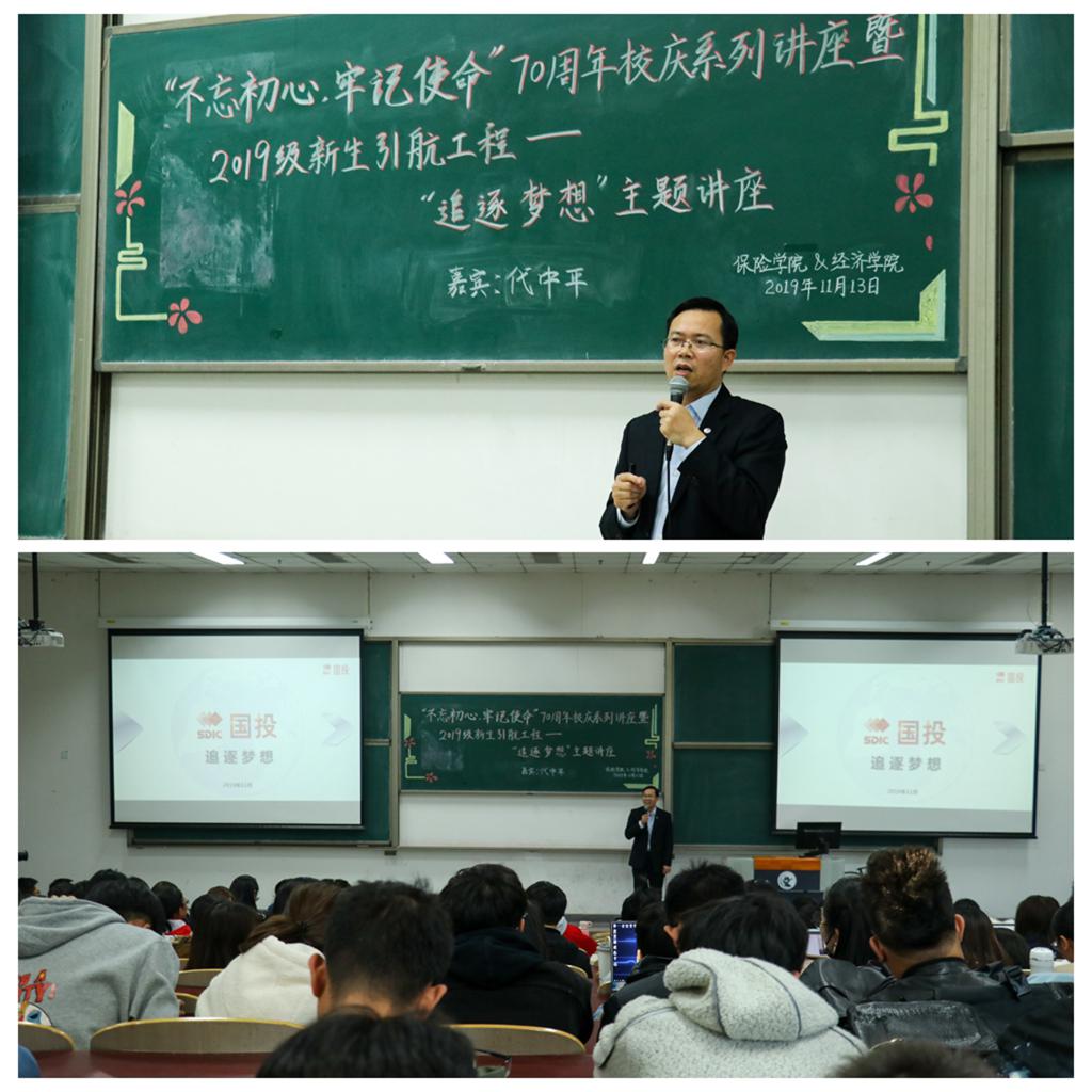 11月13日,公司邀请了国投保险经纪有限公司总经理代中平为新生做了一场题为“追逐梦想”主题讲座,代中平先生结合国投的发展和自身职业经历向同学们讲解了“初心和梦想的关系”,并向同学们提出了四点建议:认准一个目标,提高两项技能,加强三方面学习,提示四个关注事项。他表示当代中财人在实现梦想的道路上,要做到以兴趣特长为引导,努力提升自己的专业技能,注重自身多方面潜能的发掘,多实践,在探索中积累职场经验并特别强调了“初心和坚持”对于实现梦想的意义。