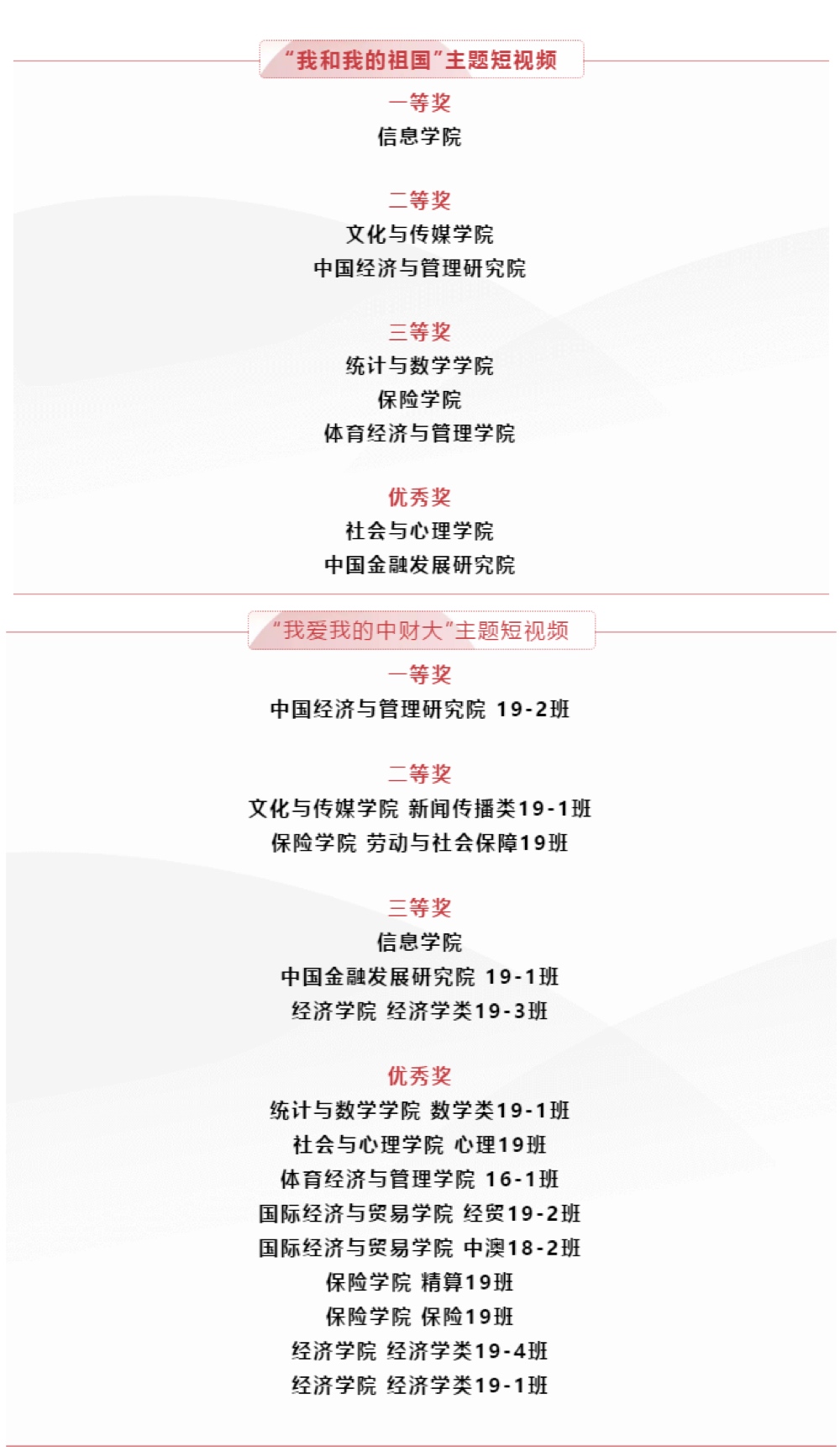 “礼赞祖国·喜迎校庆”短视频创意活动旨在体现同学爱国情怀,弘扬中财大学子卓越风采,本次活动设有“我和我的祖国”、“我爱我的中财大”两个主题。yl88858永利官网积极参加,在各个班级的共同努力下,yl88858永利官网在本次活动中取得优异成绩。