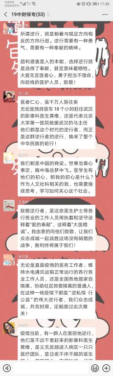 为积极响应校团委号召,2019级保险学、社保研究生团支部积极开展了“共克时艰,战疫有我”线上主题团日活动,组织成员观看《老师请回答》电视公开课和防疫科普知识视频,并通过支部微信群加强宣传工作,充分利用人民日报、新华社、丁香园公众号等资源,帮助支部成员及时了解疫情最新消息,引导支部成员通过支部微信群互动交流。