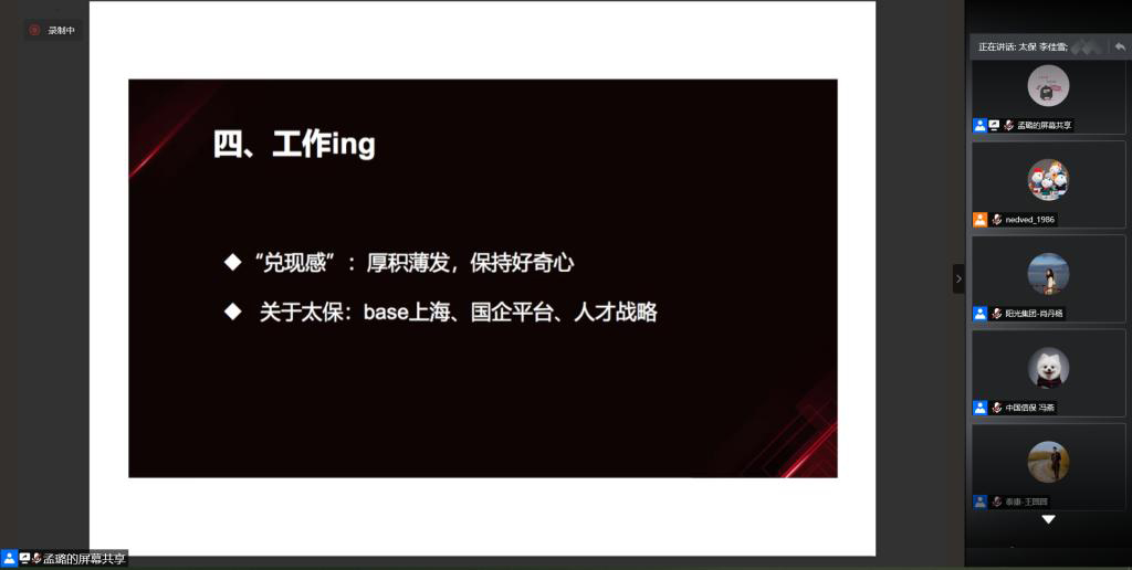 2020年11月14日晚上七点至九点,由公司举·办的“引航助力,职通未来”系列求职思“享”会第四期通过腾讯会议的方式在线上顺利举行。本次会议邀请到了就职于阳光保险的2016保险专硕肖丹杨、泰的保险2016保险研王圆圆、太平洋保险2016精算研李佳雪和中国信保2017精算研冯燕为同学带来了一场精彩的学习、求职经验分享。