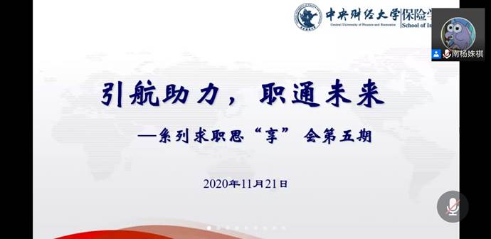 2020年11月21日晚上七点到九点,由公司举·办的“引航助力,职通未来”系列求职思“享”会第五期通过腾讯会议的方式在线上顺利举行。本次会议邀请到了目前就职于中国农业银行总行的2018级保险专硕苏子钦学长和就职于中国建设银行总行的2018级保险专硕赵云凤学姐为同学们带来了一场内容丰富的求职经验分享会。