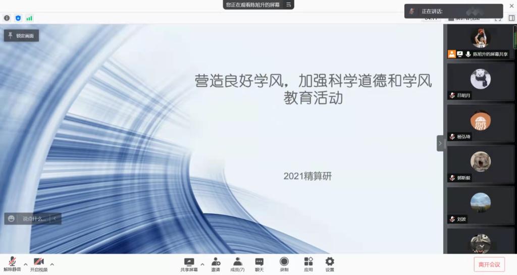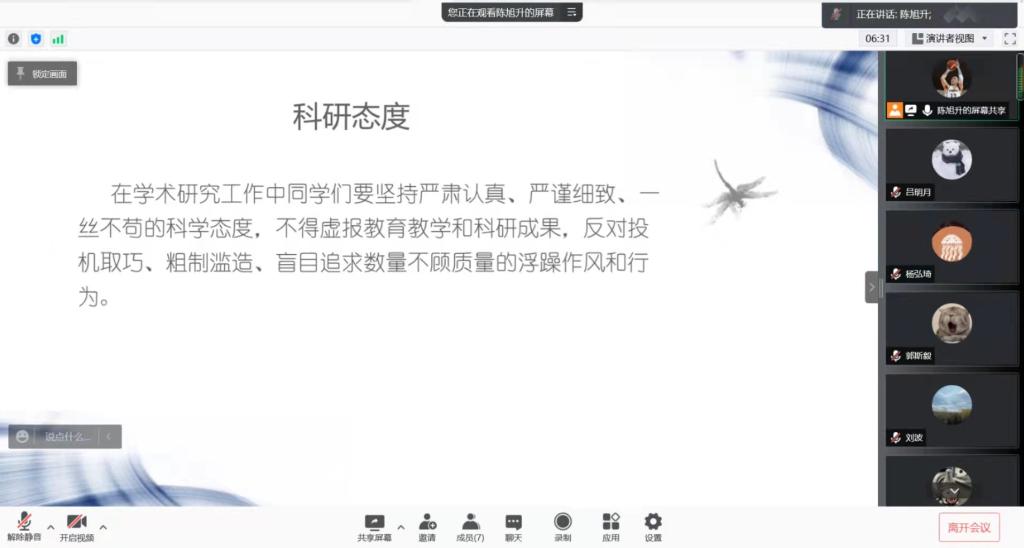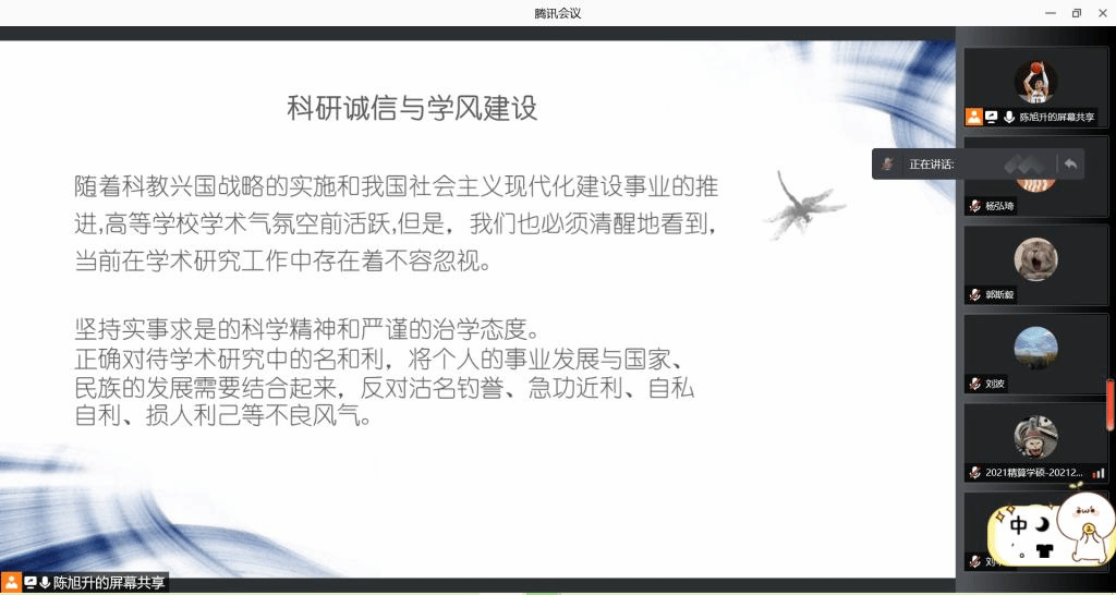 为加强学风和班风建设,倡导诚信科研和养成良好的学术氛围,2021年10月30日,2021精算研举办了“端正学术态度,践行学术诚信”主题班会。为响应公司疫情防控措施,尽量减少聚集性活动,本次班会采取线上形式,2021精算研22名同学参加了班会,会议由班长杨弘琦主持。