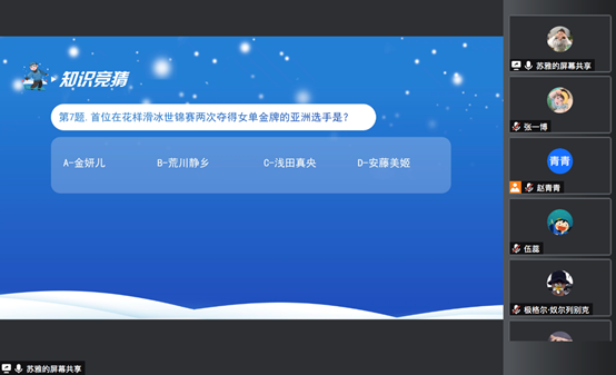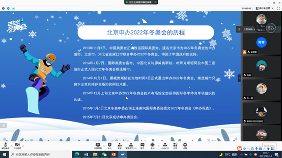 本次活动内容主要包括冬奥会介绍、冰雪项目介绍和冬奥知识竞赛三部分。首先,团支部组织委员苏雅带领大家回顾了历届冬奥会的精彩瞬间,介绍了2022年北京冬奥会的申办历程和冰雪项目。