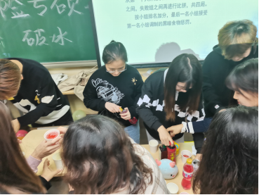 接力游戏最考验小组的分工合作,需要小组全体人员参与,轮流完成投掷乒乓球(1人)、传递乒乓球(2人)、跳绳10次(2人)、筷子传递钥匙(4人)、穿针线(1人),用时最短的小组获得本轮胜利。有的小组因缺乏技巧而多次失败,给大家贡献了特别多的欢乐,游戏体验十足。