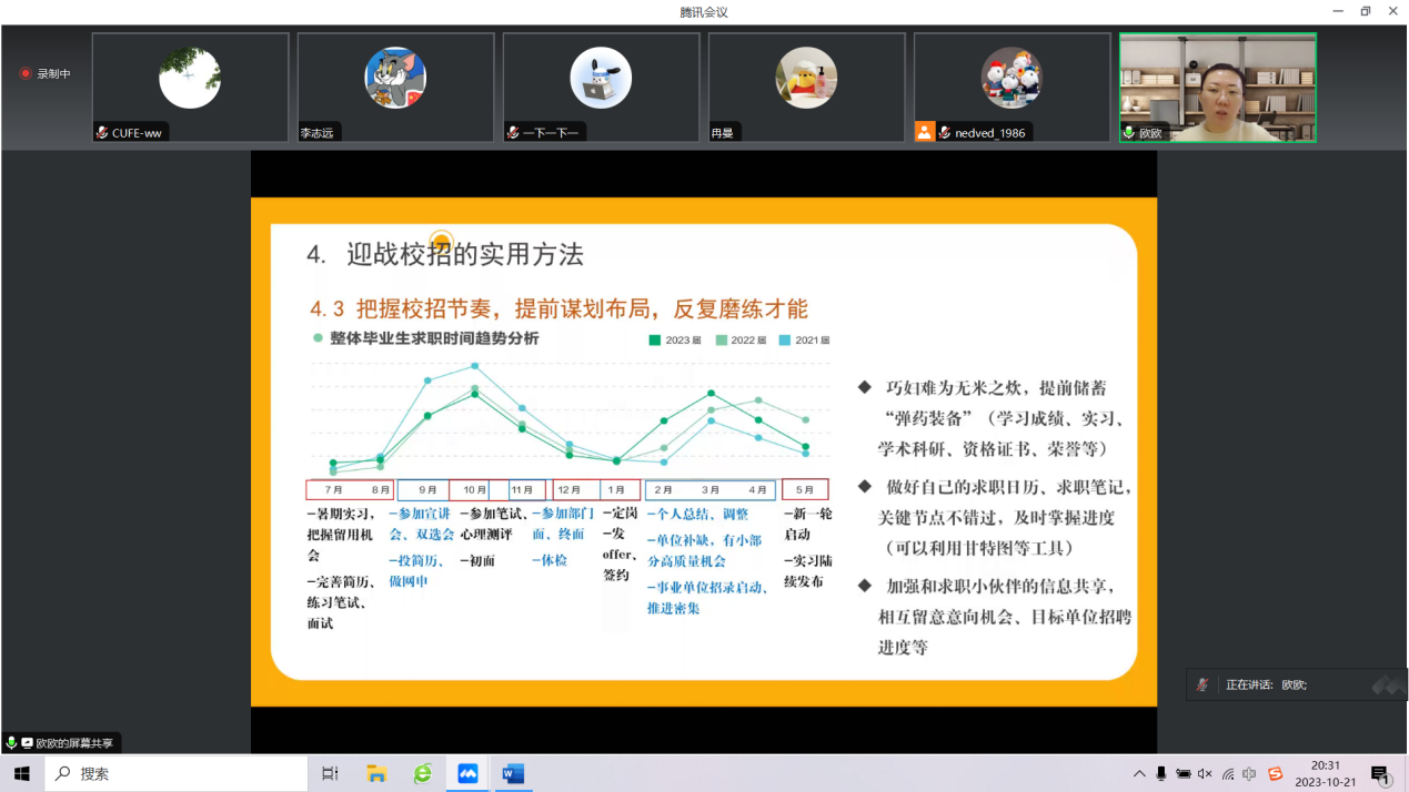 露沾草,风落木,岁方秋。金秋十月,秋招正在如火如荼的开展中。2023年10月21日晚,yl88858永利官网在线举办了“引航助力,职通未来”系列活动之就业形势分析与对策建议主题分享会。公司邀请了生涯规划师、生涯测评师,公司员工就业创业指导中心副主任欧萌老师为我们带来了更加具体的就业信息和求职指导,让我们一起来看看吧!