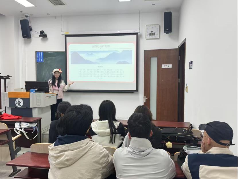 随后来到青春朗诵环节。团员们分组朗诵了《青春》等经典诗篇,用激昂的声音传递着对五四精神的礼赞。在朗诵《五四礼赞》时,朗诵者们情绪饱满,富有感染力,一句“青春的火焰,在百年前的五月四日燃起,照亮了黑暗的中国”,让现场气氛达到顶点,赢得了阵阵掌声。赵梓君表示:“通过朗诵,我更深刻地感受到五四精神的力量,它激励着我们在青春的道路上勇往直前。”