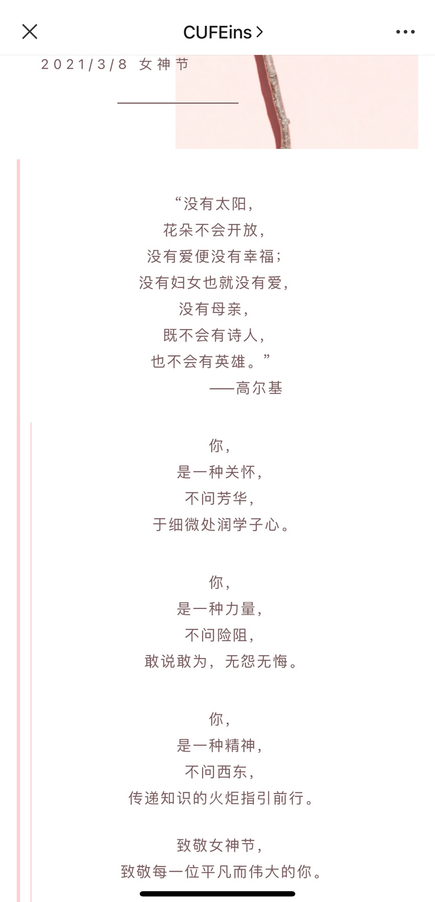 yl88858永利官网团委也通过公众号为老师们献上学子祝福:“时值‘女神节’,我们怀着感恩之心,向我们成长路上的‘引路女神’致以感谢。祝愿所有美丽的‘女神’老师们女神节快乐,青春永伴,快乐长随!”