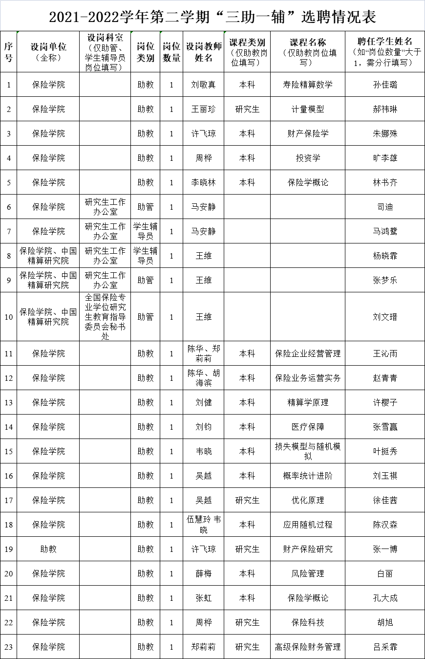 经员工申报、公司研究生工作办公室信息核实和公司教学委员会审核,2021-2022第二学期助教选聘情况如下: