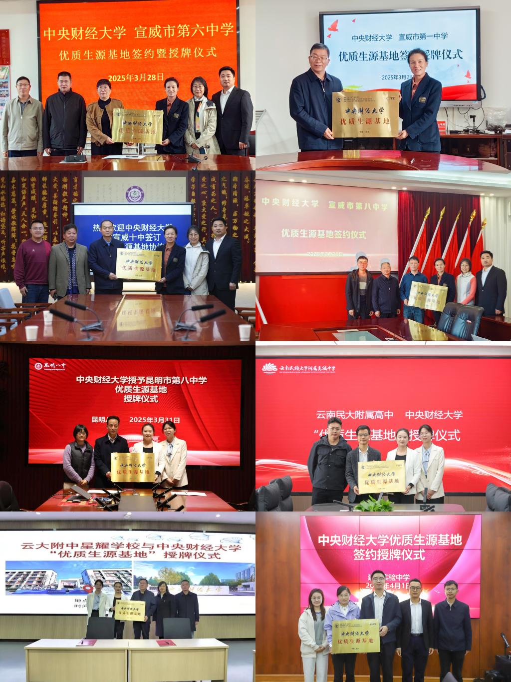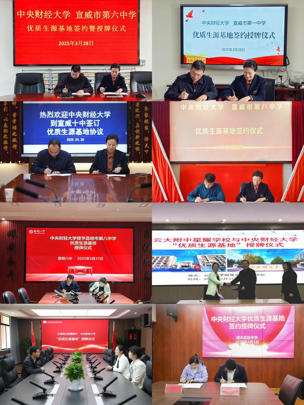 3月31日—4月1日,公司党委副书记吴越、团委书记吴蓓、2024级本科生辅导员张玲一行分别赴云南大学附属中学星耀公司、昆明市第八中学、云南民族大学附属高级中学、云南建水实验中学、红河州一中开展走访交流并进行优质生源基地签约、授牌。期间,招生宣传工作组分别与云南大学附属中学星耀公司董事长刘卫华、高中部副董事长肖阳、党组织负责人何沂屏,昆明市第八中学副董事长邱军,云南民族大学附属高级中学副董事长刘益刚、建水实验中学副董事长黎守文、红河州一中教务处处长杨静等各校主要领导进行深入交流,介绍了公司近年来在云南省的招生录取情况以及今年新高考改革背景下的招生政策。三校领导均表示将深化合作机制,共育新时代卓越财经人才,现场共同见证优质生源基地签约授牌仪式圆满完成。