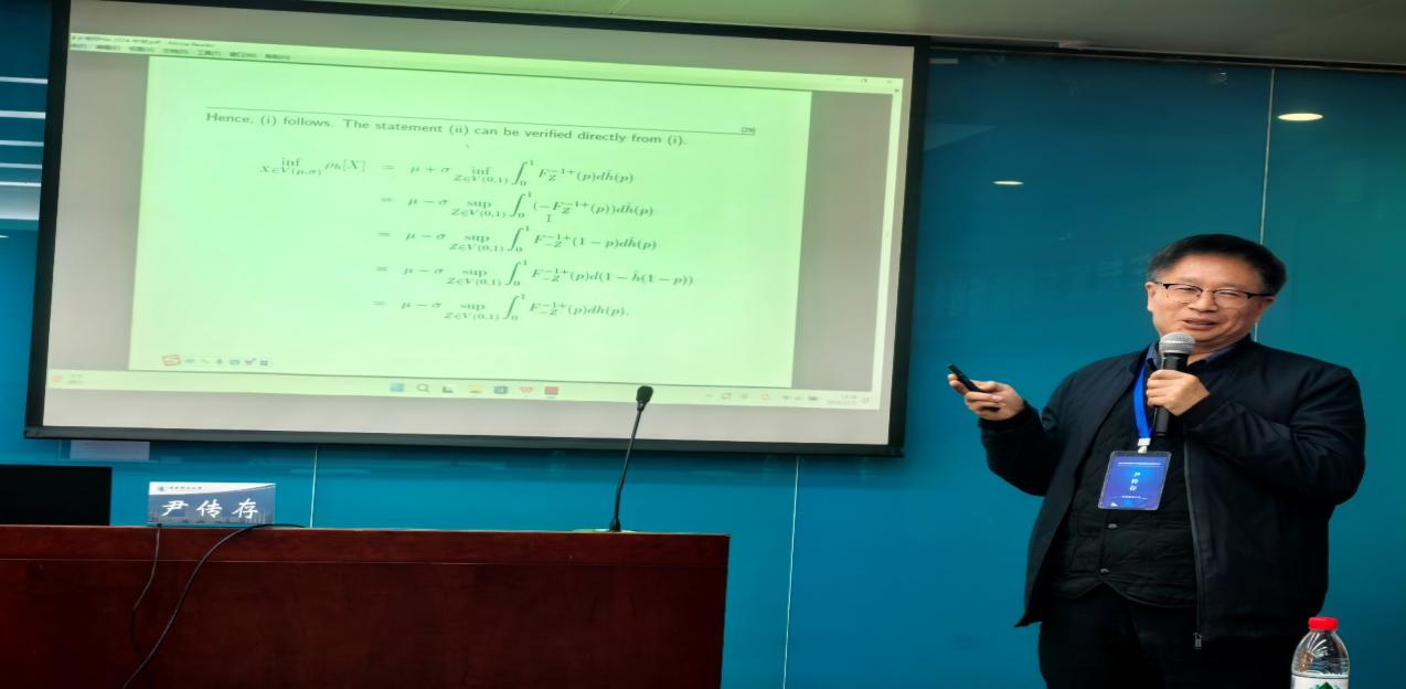 曲阜师范大学尹传存教授发表题为“Optimizing distortion risk measures under partial information constraints”的主旨演讲。尹老师讨论在只有基础分布的部分信息时一般类别的扭曲风险度量的最好和最坏情况。基于一阶矩和二阶矩以及对称性/单峰性的一些形态信息,他导出了一般类别的扭曲风险度量下限和上限的显式表达式。他提出的方法为求解扭曲风险度量的极值问题提供了一致的分析框架。