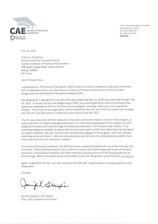 2018年5月14日,北美精算师协会(SOA)致函,确认公司正式获得了由SOA授予的“Centersof Actuarial Excellence”(CAE)认证。至此,公司成为大陆高校中第一所、也是目前唯一一所获得CAE殊荣的高校。