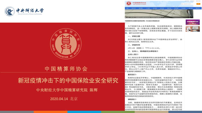 4月14日,陈辉应中国精算师协会邀请,在协会精算讲堂作《新冠疫情冲击下的中国保险业安全研究》报告,分析了这场突如其来的新冠疫情对中国保险业运行的影响,探讨了应对疫情冲击的保险对策。