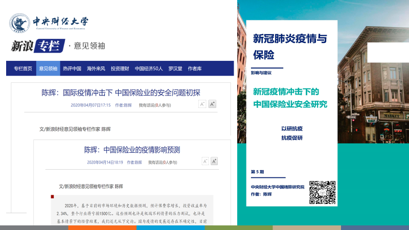 《新冠疫情冲击下的中国保险业安全研究报告》共包括10篇研究文章,该系列所有研究文章被新浪财经意见领袖专栏刊登,多篇文章被《精算通讯》转载。