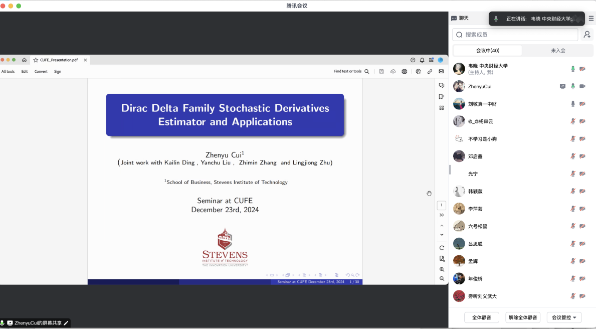 2024年12月23日上午,中国精算研究院通过腾讯会议线上成功举办了第255期精算论坛。本次论坛邀请了斯蒂文斯理工公司商公司的崔振嵛副教授作为主讲嘉宾,为与会师生带来了题为“Dirac Delta Family Stochastic Derivative Estimator and Applications”的学术报告。活动由中国精算研究院韦晓老师主持,与会师生40人。