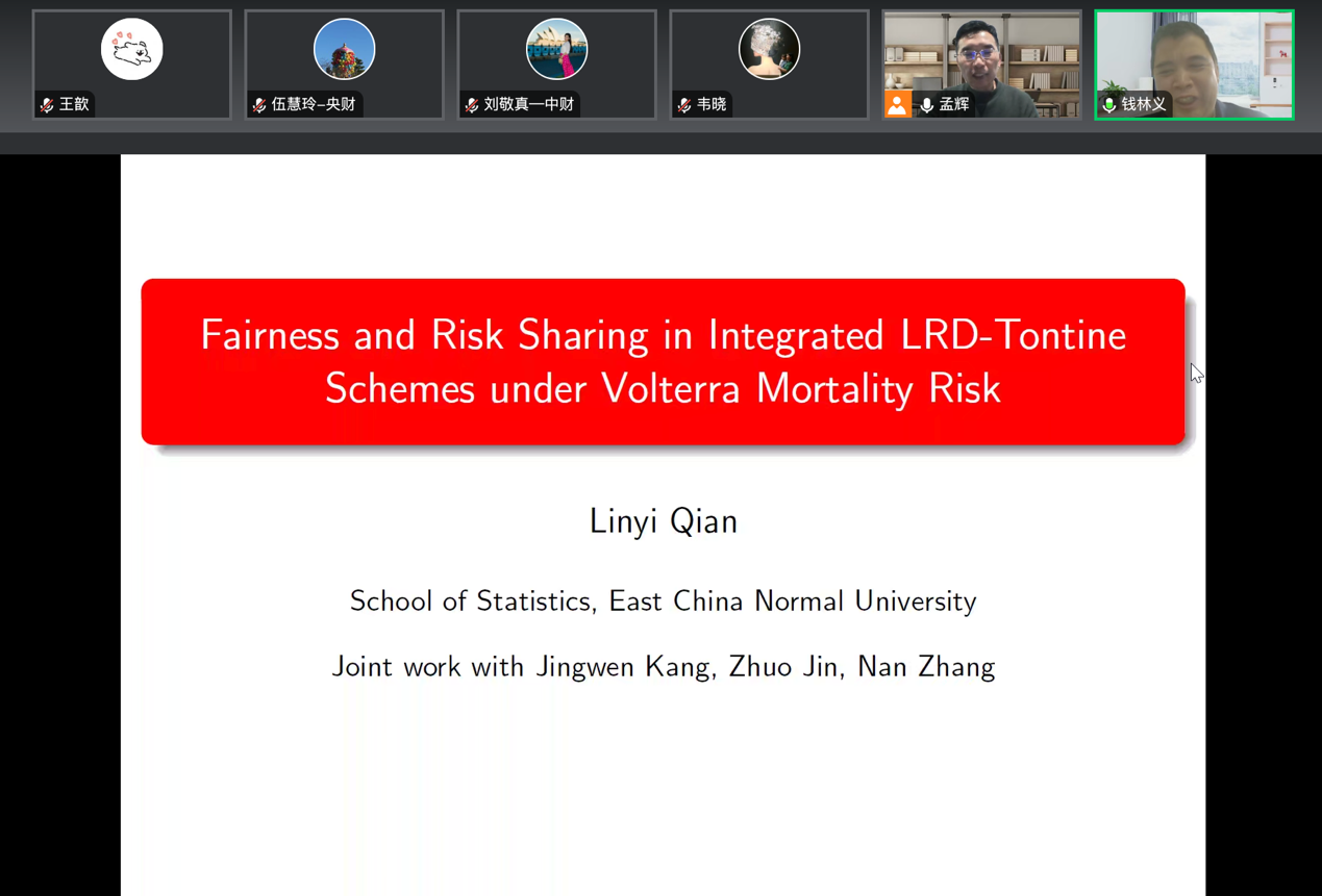 2024年12月13日上午,公司以线上形式成功举办了精算论坛第252期讲座。华东师范大学统计公司的钱林义教授应邀出席,并为与会师生带来了题为“Fairness and Risk Sharing in Integrated LRD-Tontine Schemes under Volterra Mortality”的精彩学术报告。本次讲座由公司孟辉老师主持,与会30余人。钱林义教授现任华东师范大学统计公司经理助理、保险与精算系主任,是中国准精算师,在概率统计与保险精算领域造诣深厚,曾多次获得国家和省部级学术奖项,并在国内外权威期刊上发表多篇重要学术论文,广受学界认可。