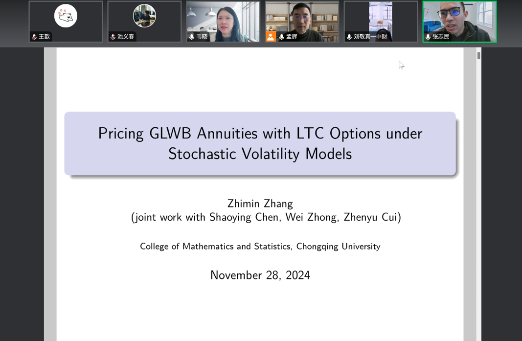 为促进金融与精算领域的学术交流,重庆大学张志民教授应邀于2024年11月29日线上为公司师生作了题为“GLWB年金定价中的长期护理选项与随机波动率框架”的精彩学术报告。张志民教授现为重庆大学教授、博士生导师,重庆市学术技术带头人,曾赴香港大学与墨尔本大学进行学术访问。他目前担任中国工业与应用数学学会理事、中国现场统计研究会风险管理与精算分会常务理事等职务,在金融统计、金融数学、风险管理与精算学、统计学习和机器学习领域发表高水平论文80余篇。