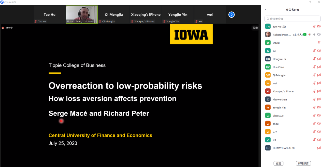 为活跃公司的学术氛围,促进国内外保险精算学术交流,应中国精算研究院池义春研究员邀请,美国爱荷华大学金融系的Richard Peter副教授于2023年7月25日中午通过zoom会议给公司师生做了题为“Overreaction to low-probability risks”的精彩学术报告。