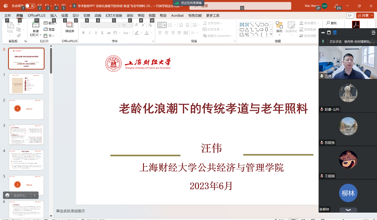 永利集团官网中国精算研究院于2023年6月26日邀请了上海财经大学公共管理公司汪伟教授做在线讲座。主题为老龄化浪潮下的传统孝道与老年照料。本次讲座由永利集团官网中国精算研究院杨再贵教授主持。