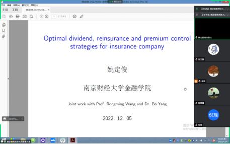姚定俊教授报告题目为“Optimal dividend, reinsurance and premium control strategies for insurance company”。文章主要研究了从保险人角度出发,以最大化累积分红为目标,保险公司最优的分红策略、再保险策略和保费策略的选择问题。假设保险公司的产品价格与索赔频率是相关的情况下(减函数、凹函数),采用动态规划原理求解出最优的比例再保险和超额损失再保险策略、最优保费策略、最优的障碍分红边界,以及最优累积分红。