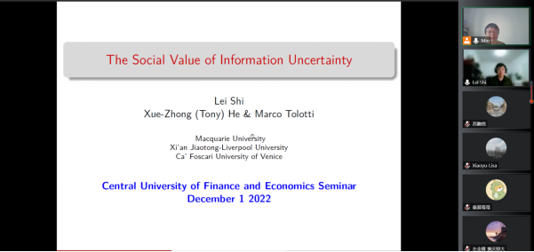 2022年12月1日,中国精算研究院精算论坛第215期在郑敏副研究员的主持下举办,论坛邀请到了麦考瑞大学的Lei Shi博士来作客,向与会师生及学者介绍了信息不确定性的社会价值。