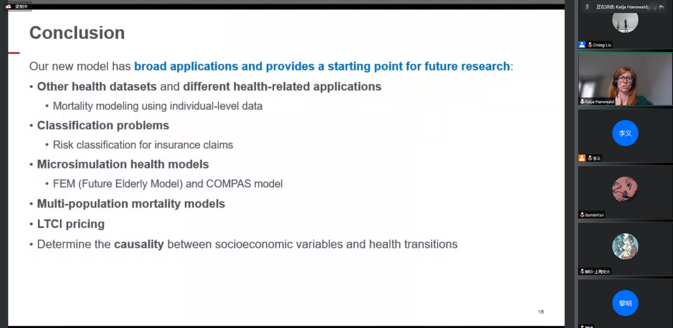 参与讲座的多位老师和员工和Katja进行了深入的讨论,包括并不限于机器学习的运用、因果分析和机器学习的结合以及健康状态转移矩阵的估计等。