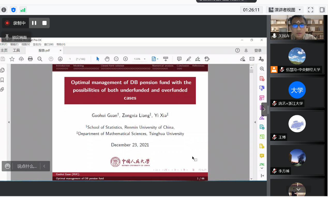 2021年12月23日下午2-4点,来自中国人民大学财政金融公司的何林教授和中国人民大学统计公司的关国卉副教授为公司师生做了主题为养老风险管理的主题报告。