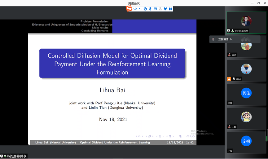 在第一场讲座中,柏教授分享了基于强化学习的连续时间熵正则化形式下的最优红利支付问题。柏老师从四个方面依次展开,首先围绕目标值函数的建立展开,为了增加不确定性在值函数中加入熵正则化,然后利用粘性解方法证明了HJB方程光滑解存在的唯一性,并证明了该解是有界凹的。同时文章证明了最优控制不再是一个阈值控制,而是一个具有“渐进”形式的截断分布。柏教授继续展示并分析了论文主要研究结果,最后还介绍了未来研究工作的计划和方向。