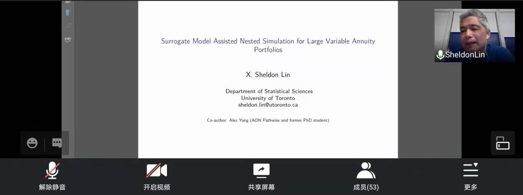 2021621日上午,中国精算研究院邀请到了加拿大多伦多大学X. Sheldon Lin教授做客精算论坛,他为大家带来了题为“Surrogate Model Assisted Nested Simulation for Large Variable Annuity Portfolios”的报告。报告由池义春研究员主持,中国精算研究院的部分师生和国内外同行等60多人参与了此次论坛。
