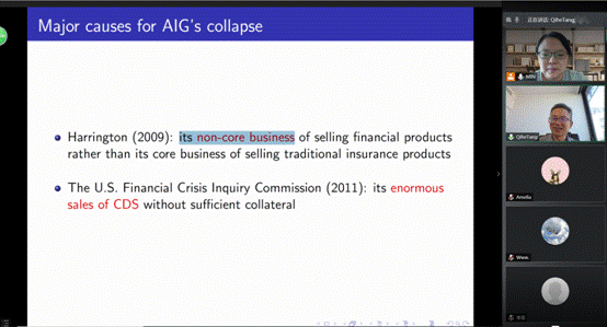 报告结束后,Tang教授就保险公司非核心业务面临的风险以及核心业务与非核心业务之间的关系与参与论坛的师生进行了深入地探讨,与会师生受益良多。 感谢公司引智项目给予的支持。