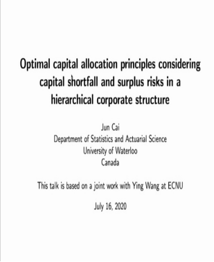 2020年7月16日上午,加拿大滑铁卢大学统计精算系的蔡军教授通过腾讯会议软件在线为公司师生做了题为“Optimal capital allocationprinciples considering capital shortfall and surplus risks in a hierarchical corporate structure”的学术报告。报告由中国精算研究院池义春研究员主持,包括公司师生在内有80多名海内外学人参与此次论坛。