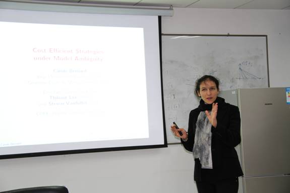 2018年1月4日上午10点-11点在学术会堂精算会议室506室,公司荣幸的邀请到了来自法国格伦诺贝尔管理公司(Grenoble Ecole de Management,France)的Carole Bernard教授为公司师生带来题为“Cost efficientstrategies under model ambiguity”的学术报告。 此次报告是公司第127期精算论坛,公司周明副经理、池义春研究院、孟辉研究院、吴慧玲副研究员、韦晓副教授、刘敬真副教授等师生参加了此次论坛。