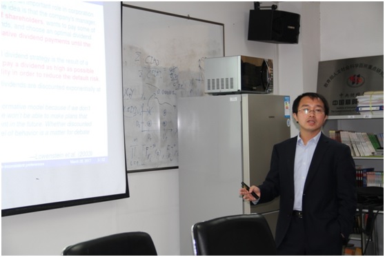 曾燕教授向大家展示了他的关于时间不一致偏好近期的研究成果,他的文章中主要考虑了在广义扩散模型下的最优分红策略,他假设公司的管理者具有时间不一致偏好的特性,并且当公司破产时公司的管理者会受到一定的惩罚,在此类假设的基础上得到了公司的最优分红策略。他把时间不一致的情况分成了基准类(先考虑时间一致的情况作为基准)、naive 、 sophisticated这三种情况,然后分别求出了这三种情况的解析解。他们的结果显示出了具有sophisticated 这种特性的公司管理者比naive 的管理者更加愿意早一点分红,具有naïve特性的公司管理者比时间一致的管理者愿意早一点分红。最后曾燕教授举出几个具有代表性的例子来帮助在座的听众更好地理解他的研究思路。在讲座中,曾教授重点介绍了时间一致性和时间不一致性的区别,还有三类时间不一致性质的具体含义,在模型中怎么体现出时间不一致性,使在座的各位老师和同学受益匪浅。