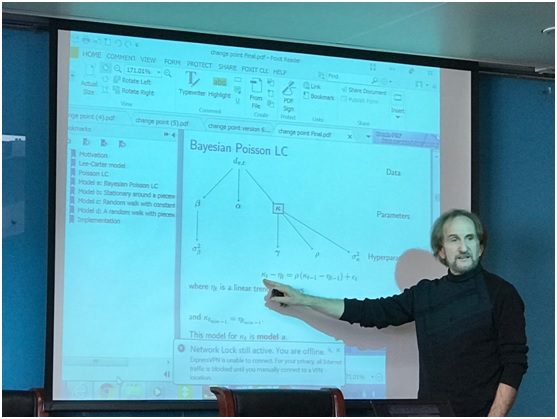 本次讲座题为“Extensions to the Bayesian Lee-Carter model, allowing for change points”,上午十点在学术会堂北楼702准时开始。此次报告也是公司第八十八期精算论坛讲座,特邀了来自比利时布鲁塞尔自由大学的姚经博士作报告主持。公司的周明副经理、周桦副经理、池义春研究员,以及相关专业的同学参加了此次论坛讲座。