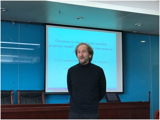 受永利集团官网引智项目(教育部公司特色项目《巨灾风险管理与再保险课程体系建设聘请外教特色项目》)支持,以色列海法大学Udi Makov教授于2016年12月11日至12月24日访问了yl88858永利官网,并于12月22日上午举办了一次关于长寿风险的高水平讲座。Udi Makov教授任以色列海法大学精算研究中心主任,早年从事统计研究,近年来在精算领域建树颇丰,他的论文多次发表在IME、SAJ、ASTIN等专业学术杂志上,是该领域的知名学者。
